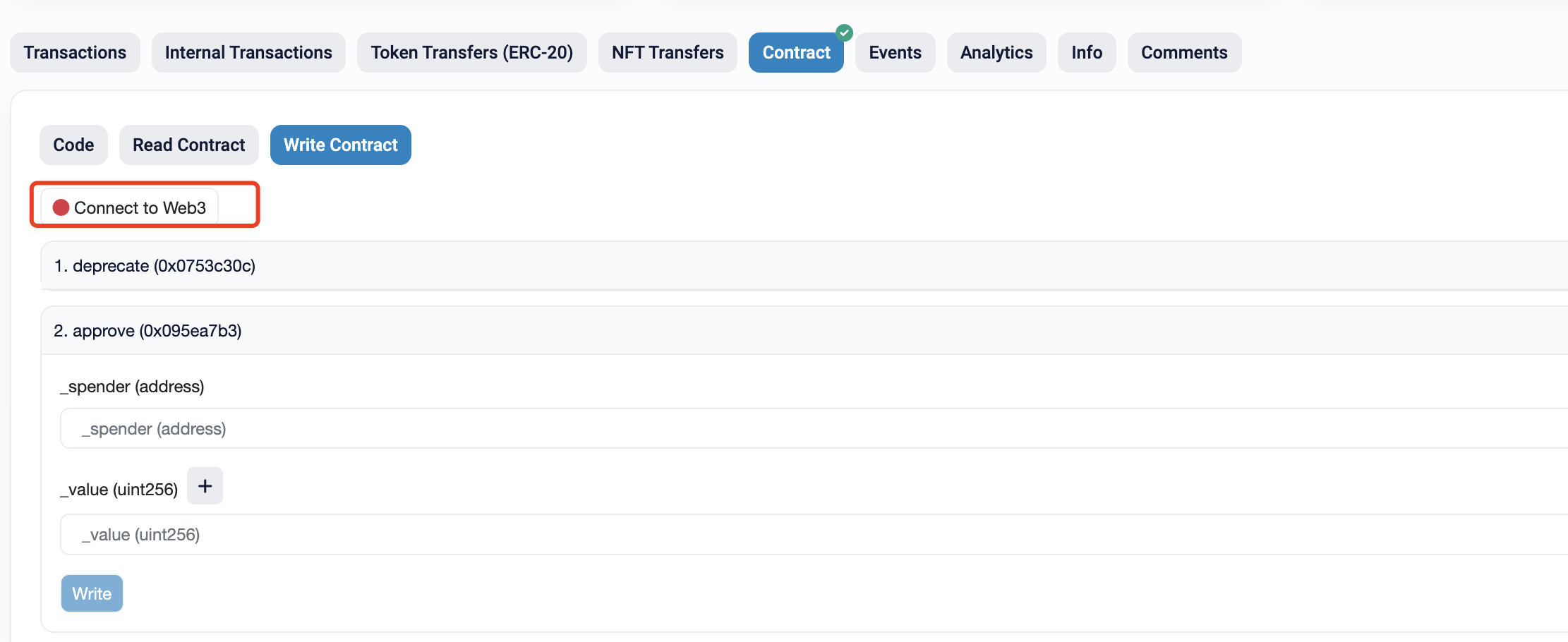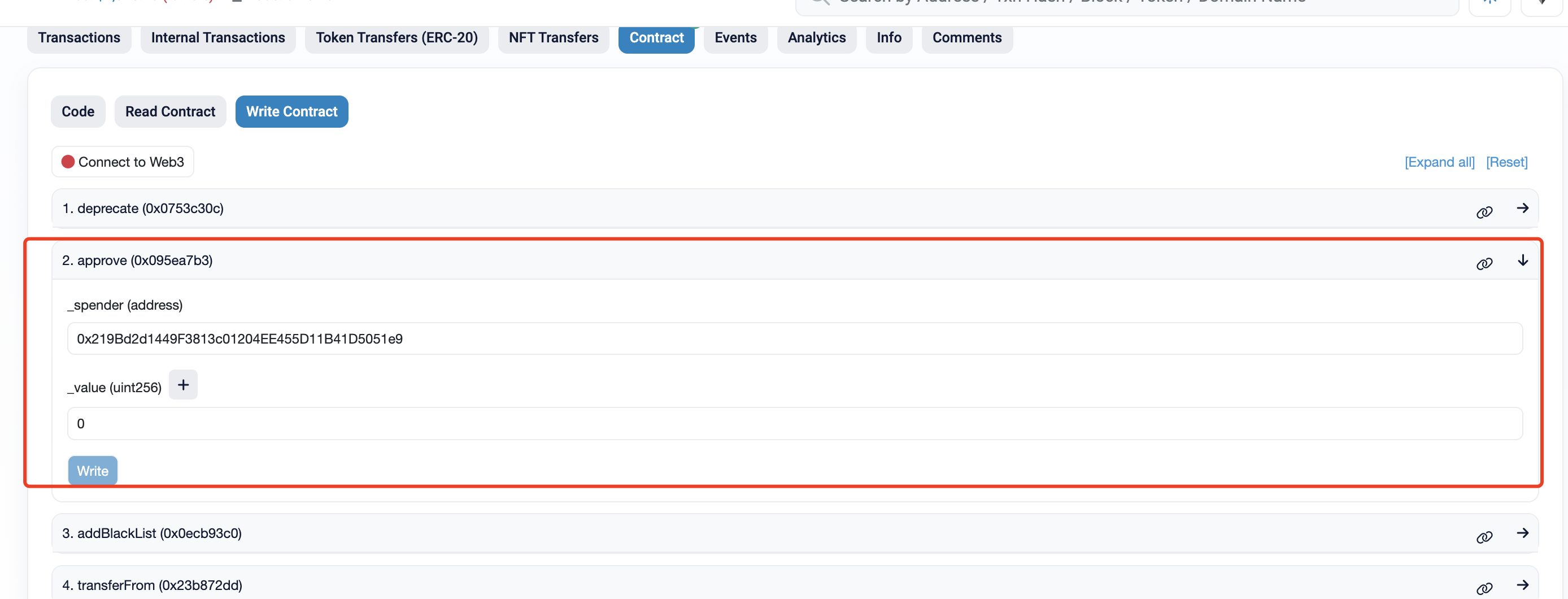 1. Enter the [USDT Write Contract](https://etherscan.io/address/0xdac17f958d2ee523a2206206994597c13d831ec7#writeContract).
